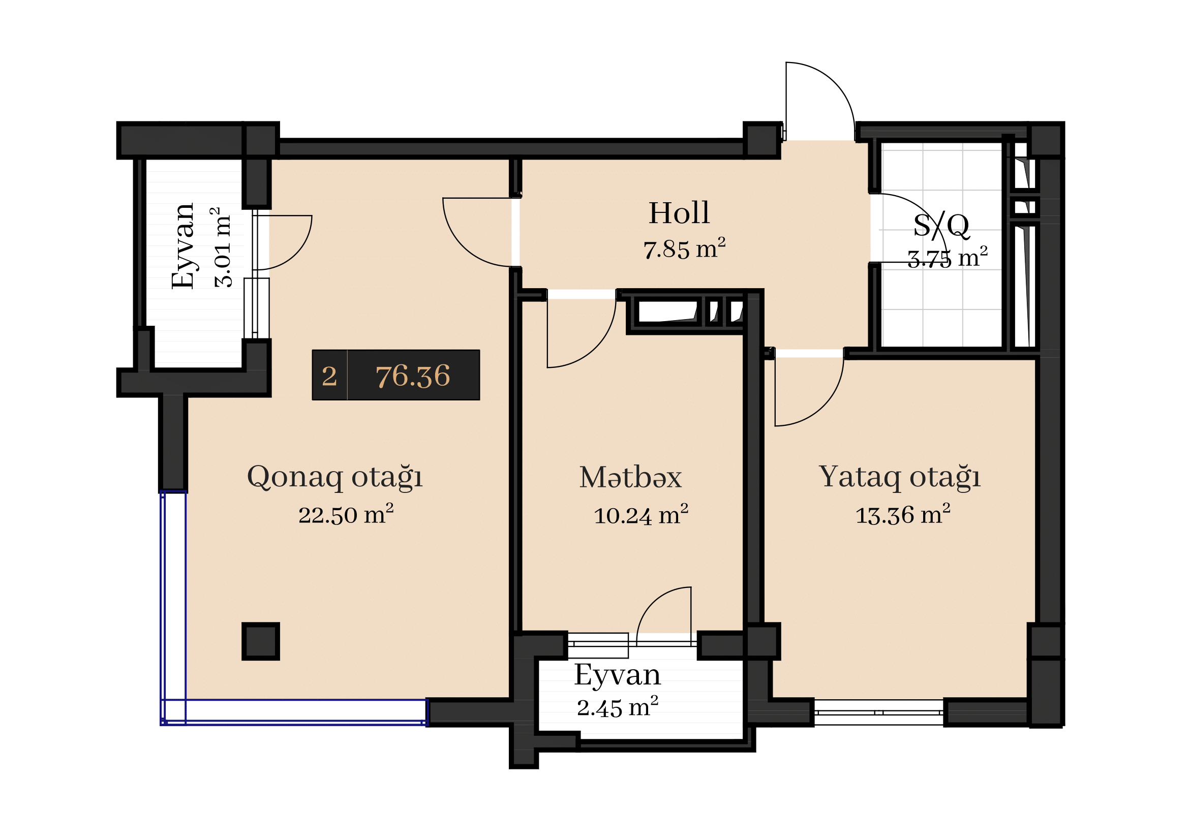 2 otaqlı 76.36 m²